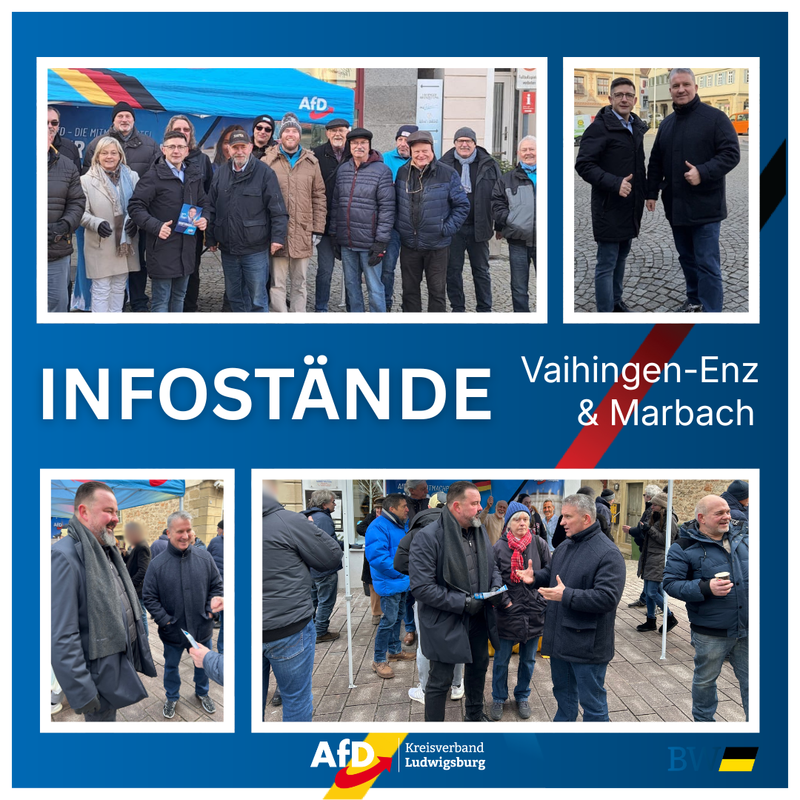Liebe Mitglieder, Förderer und Freunde unserer AfD Ludwigsburg, folgende Infostände sind bis zur Landtagswahl am 08.03.026 geplant. Sollten sich Änderungen erge...