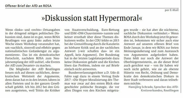 Leserbrief unseres Sprechers Hansjörg Schrade an das Bündniss "ROSA" (Reutlingen for Organization, Solidarity and Actions)