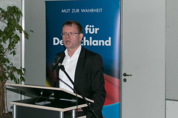 Der erste Redner des Abends war Dr. Dirk Spaniel aus Stuttgart. Als Mitglied im Verkehrsausschuss kritisierte er die ab 2019 kommenden Fahrverbote in Stuttgart und kündigte an, dass sobald diese in Kraft treten, die AfD dagegen klagen wird. Er führte aus, dass aufgrund neuer Abgas-Testverfahren ab 2021 mit einer deutlichen Verteuerung von Fahrzeugen mit Verbrennungsmotoren zu rechnen ist. Ursache sind neue Zielvorgaben für C02, die von der Automobilindustrie nicht zu erreichen sind.