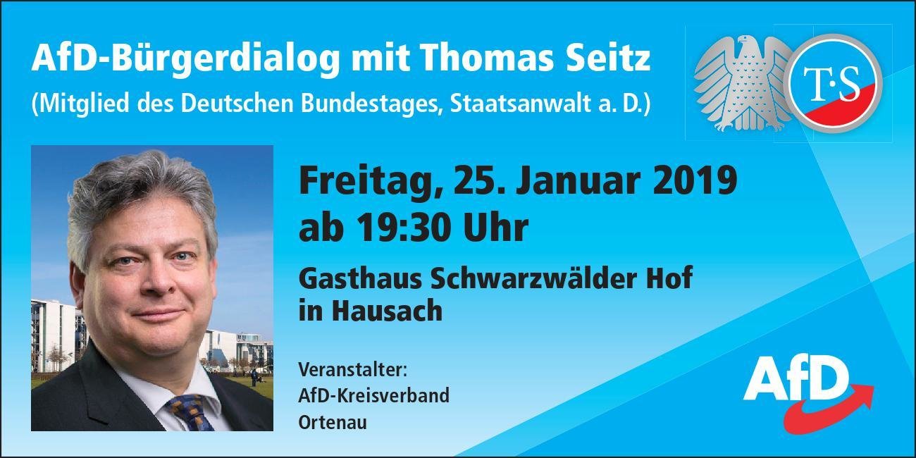 Thomas Seitz ist Mitglied des Deutschen Bundestags und vertritt den Wahlkreis Emmendingen-Lahr. Zudem betreut er für die AfD den Wahlkreis Offenburg. Seitz ist mit dem Ziel angetreten, dass er "unter einer erfolgreichen parlamentarischen Arbeit verstehe, dass die AfD den Altparteien ihre Themen aufzwinge und zur Umsetzung von Forderungen der AfD bewege. Der Slogan AfD wirkt, müsse für die Bürger zur täglich spürbaren Realität werden.“