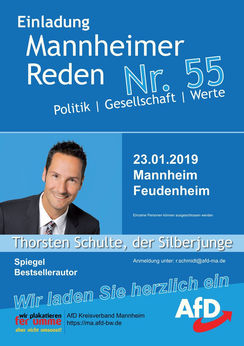 Der Kreisverband Mannheim begrüßt am Mittwoch, den 23.01.2019 den Spiegel Bestsellerautor ( „ Kontrollverlust“) und AfD Mitglied Thorsten Schulte zu einem Vortrag.