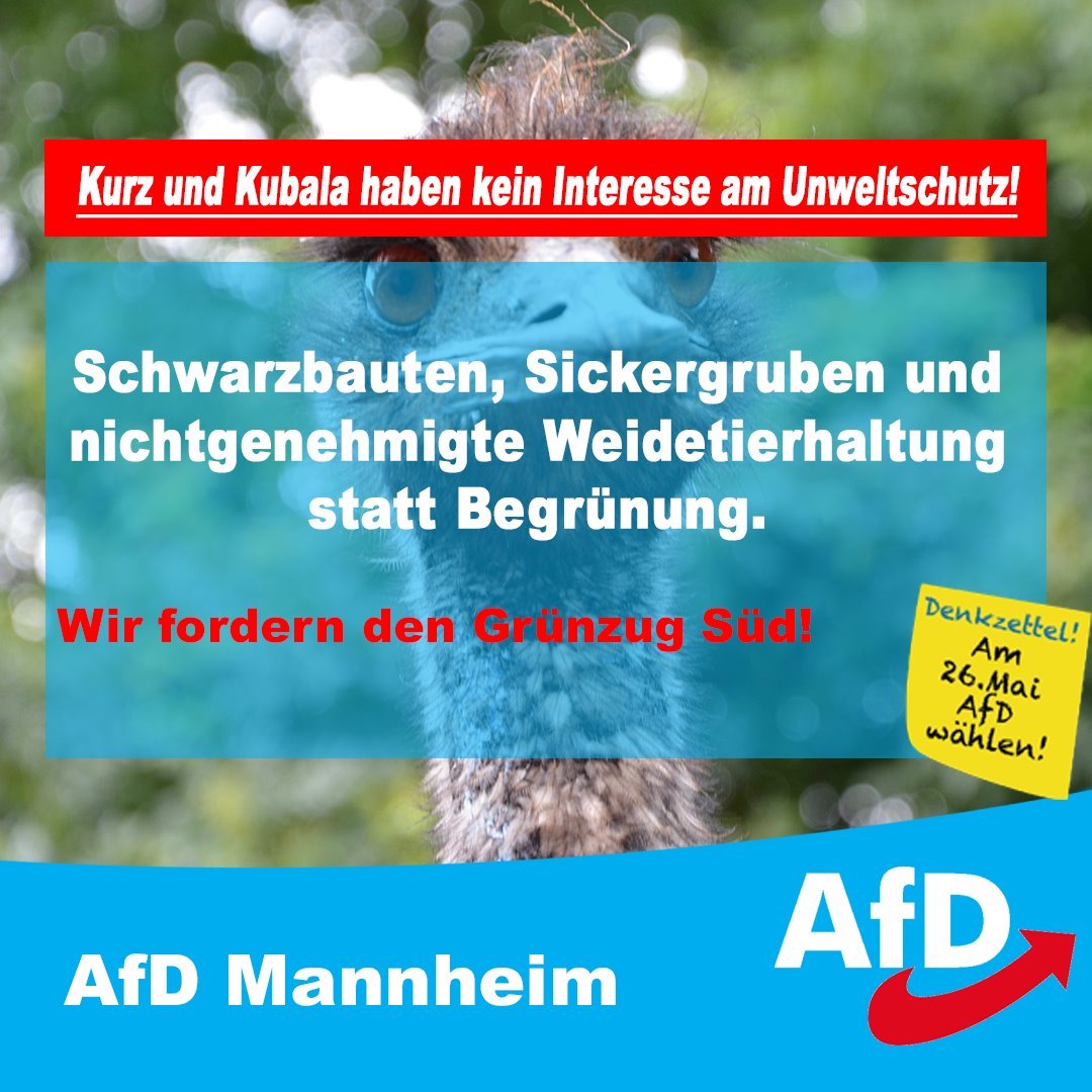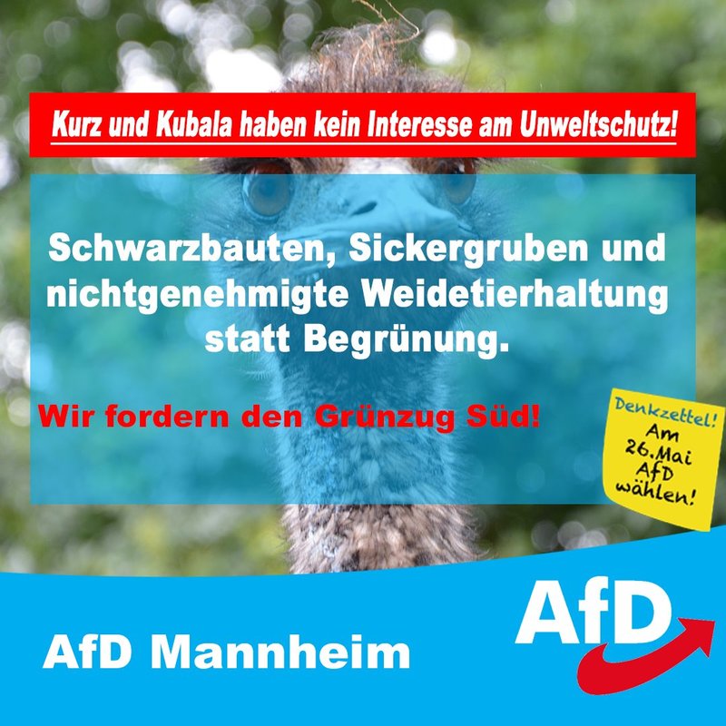 "Schwerter zu Pflugscharen". Entsprechend der alten Forderung der Friedensbewegung toleriert die Stadt mittlerweile eine Nutzung der geplanten Grünfläche, die landwirtschaftliche Züge annimmt. Von dem grünen Umweltbewußsein, dass medienwirksam insziniert wird, fehlt in der Praxis jede Spur: Der derzeitige Grundstückspächter betreibt eine Emuhaltung und beherbergt weitere Weidetiere, ohne dies der Stadt angemeldet zu haben. Ob diese Tiere artgerecht nach den Vorschriften des Tierschutzgesetzes gehalten werden, darf in Frage gestellt werden. Viele der dort inzwischen entstandenen Bauanlagen sind baurechtlich unzulässig entstanden. Die Wohnhäuser sind nicht an die Kanalisation und Trinkwasserversorgung der Stadt Mannheim angeschlossen. Schmutzwasser wird in Gruben gesammelt und bei Bedarf abgepumpt. Das Trinkwasser entstammt aus gebohrten Brunnen. Wo der Bürger eigentlich an Schmetterlinge, Eichhörnchen und Singvögel denken sollte, fühlt er sich an Kalkutta erinnert.