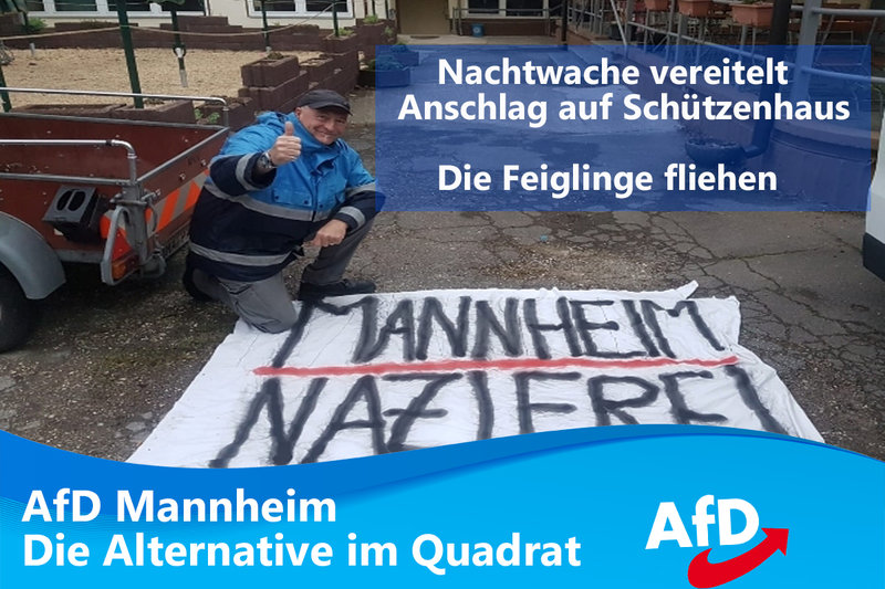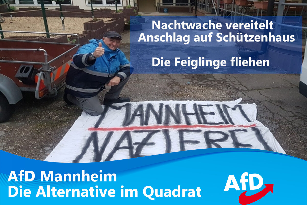 In der Nacht auf Sonntag hat unsere Nachtwache vor dem Schützenhaus einen feigen Anschlag von Linksterroristen verhindert. Gegen 3:00 erschienen mehrere Personen mit Sprädosen, Farbbeuteln und womöglich weiteren gefährlichen Gegenständen bewaffnet um ihr schändliches Werk zu verüben. Sie haben nicht mit der Nachtwache des Kreisverbandes Mannheim gerechnet und suchten ihr Heil in der Flucht. Gesicht zeigen sieht anders aus.