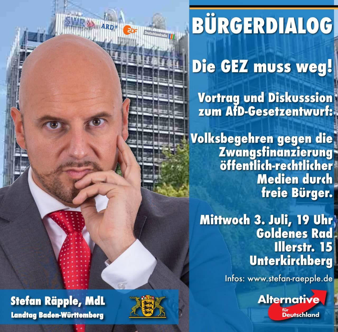 Der Initiator des Volksbegehrens war Stefan Räpple der AfD Landtagsabgeordnete, der für mehr Demokratie durch die Bürgerfreientscheide und gegen die Zwangsfinanzierung öffentlich-rechtlicher Medien durch freie Bürger plädiert.