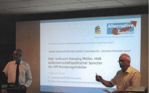 Gastredner Hansjörg Müller, Diplom-Volkswirt und Mitglied im Bundestagsausschuss für Wirtschaft und Energie, sah in der "Geldschöpfung aus dem Nichts" durch Banken das Grundübel, differenzierte aber klar zwischen Sparkassen und Volksbanken als "unverzichtbare Partner der Bürger und des Mittelstands" und dem "unseriösen Gebaren von Finanzkonzernen". Grenzen seien notwendig, um wirtschaftliche Freiheit zu ermöglichen, welche die Grundlage einer freien Gesellschaft sei. Der "staatliche Bürokratiewahnsinn" sei zu beenden, er bezweifle aber, dass dies innerhalb der EU möglich sei. Als zügig umsetzbare Maßnahmen forderte Müller eine Besteuerung von Konzernen an der inländischen Betriebsstätte sowie die Beendigung der Bevorzugung von Großunternehmen zu Lasten der Kleinen, etwa bei der EEG-Umlage. Die Privilegien des Finanzmarkts müssten abgeschafft und nicht ausgeschüttete Gewinne des Mittelstands steuerfrei gestellt werden. Aufgrund überhöhter Besteuerung der Leistungsträger hätten die Deutschen nach den Portugiesen die zweitniedrigste Vermögensbildung unter den alten EU-Staaten. Deshalb sei der "Moloch Staat" zu verkleinern und Vermögensaufbau durch Senkungen von Abgaben und Steuern zu ermöglichen, etwa der Mehrwertsteuer. Solche Maßnahmen widersprächen den Interessen der "Globalen Finanzoligarchie". Im Mittelalter hätten die Feudalherren ihre Vasallen unterdrückt. Im heutigen "Neo-Feudalismus" unterdrücke eine Finanzoligarchie die in der Realwirtschaft Tätigen. Die Macht liege jetzt bei supranationalen Organisationen wie der EU, bei NGO's, bei Investmentbanken, bei Ratingagenturen sowie bei großen Anwalts- und Wirtschaftsprüfungskanzleien. Die Lösung im nationalen Interesse müsse darin bestehen, dass der Staat wieder eine freiheitliche Ordnung schaffe, welche die feudalistischen Strukturen neutralisiere und die Soziale Marktwirtschaft wiederbelebe.