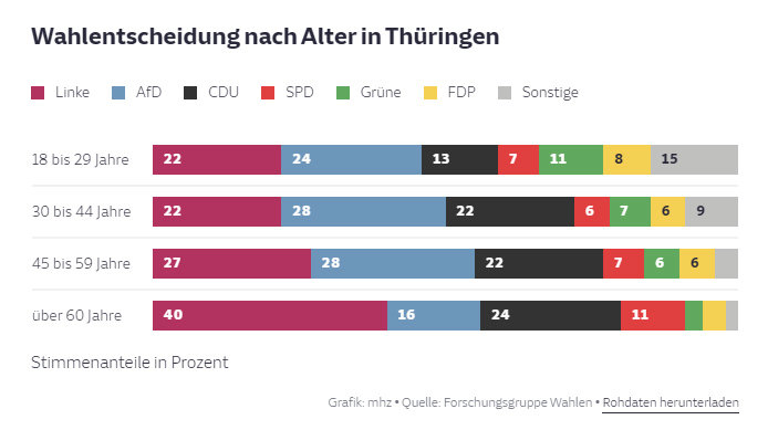 Selbst in der Altersgruppe der 18- bis 29-jährigen ist die AfD stärkste Partei geworden. Und ausgerechnet in der Gruppe, die die Medien so gerne der AfD zuschustern wollen (die alten reaktionären weißen Männer), ist sie mit Abstand am schwächsten.