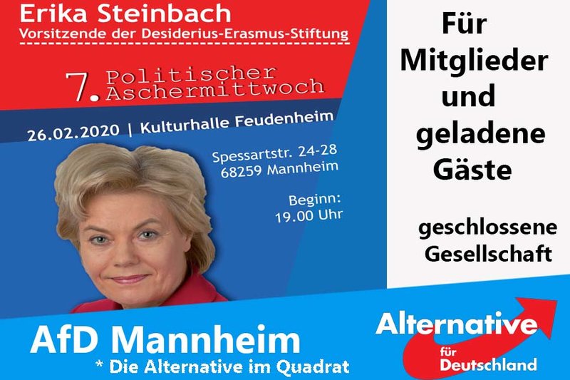 Am 26.02.2020 jährt sich zum 7. Mal der politische Aschermittwoch in Mannheim. Nach den Herren Geiger, Hampel, Schmidt, Junge, Königer und Glaser hält mit Frau Erika Steinbach zum ersten Mal eine Frau die Aschermittwochsrede. Frau Steinbach saß über 20 Jahre für die CDU im Bundestag. Die ehemalige Bundesvorsitzende des Bundes der Vertriebenen ist aktuell die Vorsitzende der Afd nahen Desiderus Erasmus Stiftung.