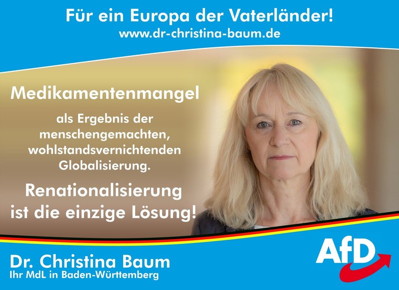Stuttgart. Am vergangenen Freitag erfuhr die Zahnärztin und Landtagsabgeordnete, Dr. Christina Baum, dass das in ihrer Praxis verwendete Anästhetikum vor Ende März auf keinen Fall lieferbar sei. Diesen Zustand kennt Baum nur noch aus den letzten Tagen der DDR, als dort das Anästhetikum knapp wurde und ihr Ehemann mit Paketen aus dem Westen aushalf.