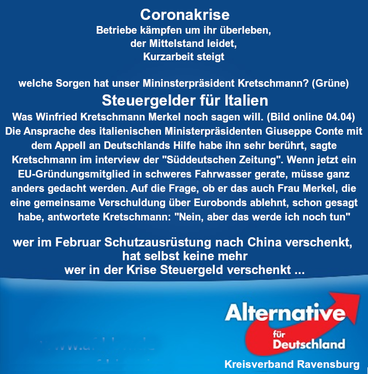 Die Ansprache des italienischen Ministerpräsidenten Giuseppe Conte mit dem Appell an Deutschlands Hilfe habe ihn sehr berührt, sagte Kretschmann im interview der "Süddeutschen Zeitung". Wenn jetzt ein EU-Gründungsmitglied in schweres Fahrwasser gerate, müsse ganz anders gedacht werden. Auf die Frage, ob er das auch Frau Merkel, die eine gemeinsame Verschuldung über Eurobonds ablehnt, schon gesagt habe, antwortete Kretschmann: "Nein, aber das werde ich noch tun"