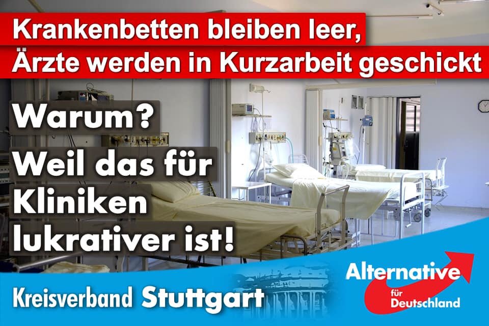 Die Regierung zahlt gerade jeder Klinik pro Tag € 560,00 (!) für jedes freie Bett, das aus "Verschiebung von planbaren Maßnahmen" stammt. Mit anderen Worten: Kliniken verdienen momentan mehr, wenn sie Operationen nicht durchführen, als wenn sie dies tun.