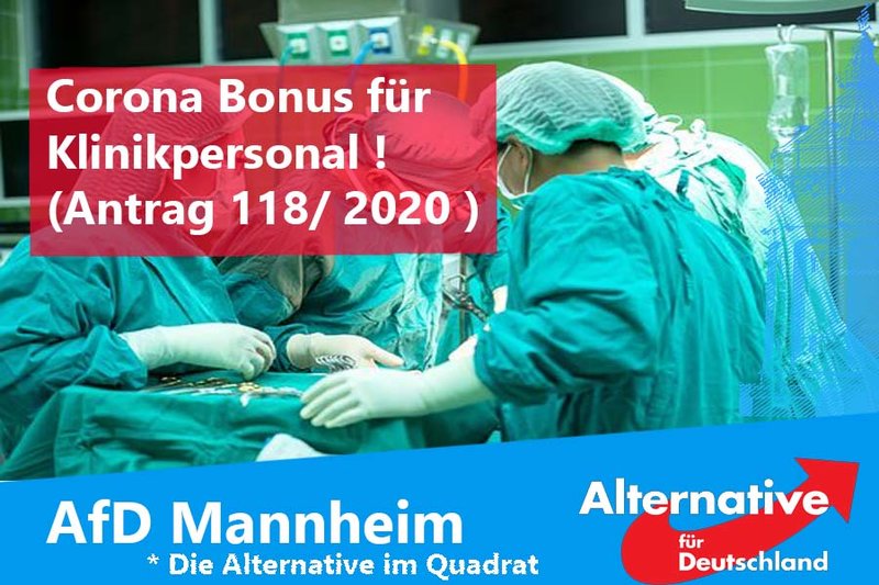 Was Spahn nicht hinbekommt, möchte die AfD Fraktion wenigstens den Angestellten der 3 Mannheimer Krankenhäuser zukommen lassen. Ausweislich der Tagesordnung zur Sitzung des Gemeinderates der Stadt Mannheim am 28.04.2020 hat die AfD Fraktion beantragt, eine Sonderprämie für Ärzte und Pflegekräfte der drei Mannheimer Krankenhäuser als Anerkennung der zusätzlichen Belastung durch die Covid-19 Pandemie zu zahlen. Der Bonus soll für Monate Februar und März eine Sonderprämie von 500 Euro pro Monat also zusammen 1000 Euro unfassen.