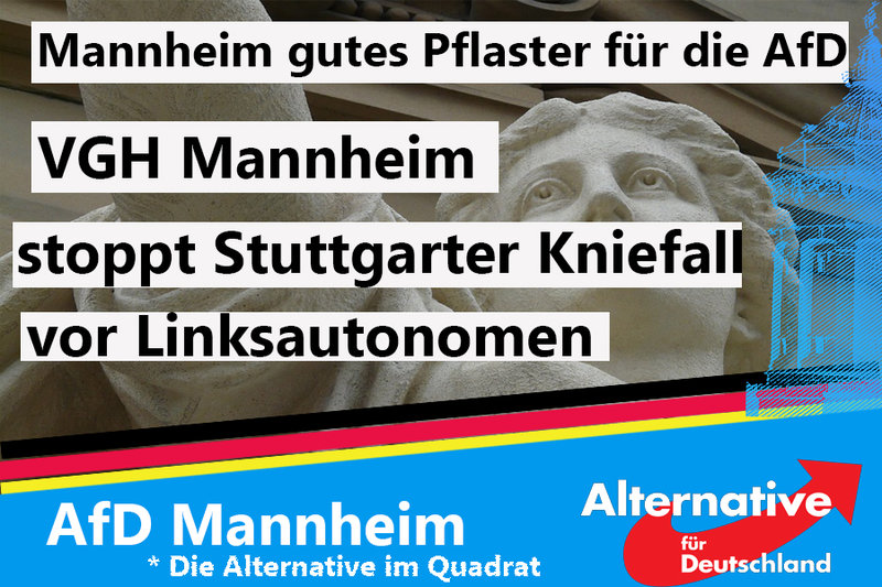 Mannheim ist für die AfD ein gutes Pflaster. Entsprechend kassierte der Verwaltungsgerichtshof Mannheim in einer heutigen Eilentscheidung das Stuttgarter Skandalurteil zu großen Teilen  pulverisierte den Rechtsbruch des GRÜN regierten Stuttgart und stellte am Tag des Grundgesetzes klar: Es gibt keine Herrschaft des Unrechts: Deutschland ist ein Rechtsstaat und beugt sich nicht dem Unrecht. Die Justiz funktioniert noch und nun ist die Politik gefordert, umzusetzen, was ihnen das Mannheimer Gericht ins Stammbuch geschrieben hat: Recht und Ordnung wieder herzustellen. Da dies den Roten und Grünen naturgemäß schwerfällt und sich die Schwarzen für das Mitregieren diese Kompetenz aufgegeben haben, ist die AfD die einzige verbliebene Partei, die für Recht und Gesetz einsteht.  Wir werden mit Argusaugen darauf achten und bei jeder Gelegenheit die angemahnten Parteien an ihre Aufgabe erinnern. Vergangenes Wochenende wurde ein friedlicher Demonstrant mittels aufgesetzten Kopfschuss aus einer Schreckschusspistole fast getötet. Er schwebt noch immer in Lebensgefahr.  Es ist bedenklich, dass es so weit kommen musste: erheblicher Gewalt von Demokratiefeinden hat inzwischen einen Einfluss auf unser aller Leben.