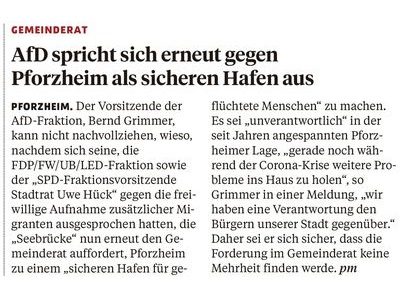 Angesichts der Tatsache, dass sich erst vor wenigen Wochen die AfD-Fraktion, die FDP/FW/UB/LED-Fraktion und auch der SPD-Fraktionsvorsitzende, Stadtrat Hück, klar gegen die freiwillige Aufnahme zusätzlicher Migranten ausgesprochen haben, kann Stadtrat Grimmer nicht nachvollziehen, dass die Pforzheimer Seebrücken-Gruppe nun erneut den Gemeinderat auffordert, Pforzheim zu einem „sicheren Hafen für geflüchtete Menschen“ zu machen. „Abgesehen davon, dass das Land Baden-Württemberg bei der Aufnahme mehr als sein Soll erfüllt hat, was auch von der Grünen-Landtagsfraktion bestätigt wird, ist es unverantwortlich, in der seit Jahren angespannten Pforzheimer Lage durch fehlende Arbeitsplätze, Wohnraummangel, fehlende und überlastete Kitas, Raumnot in den Schulen und einer hohen städtischen Schuldenlast auch gerade noch während der Corona-Krise weitere Probleme ins Haus zu holen“, so Grimmer, „wir haben eine Verantwortung den Bürgern unserer Stadt gegenüber, und der Gemeinderat wird dieser Verantwortung nachkommen. Deshalb bin ich mir sicher, dass die Forderung der Seebrücken-Gruppe für zusätzliche freiwillige Kontingente keine Mehrheit im Gemeinderat finden wird.“