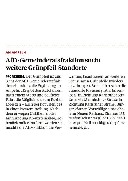 Die AfD-Gemeinderatsfraktion möchte nun die Verwaltung beauftragen, an weiteren Kreuzungen Grünpfeile (wieder) anzubringen, und bittet die Pforzheimer Bürger um Vorschläge hierzu, die an folgende Adresse eingereicht werden können:
