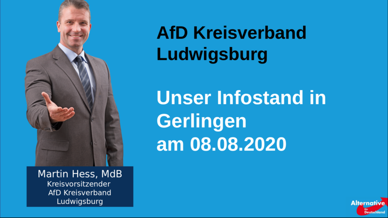 Auch am letzten Samstag war der AfD-Kreisverband Ludwigsburg wieder für Freiheit, Wohlstand und Sicherheit im Einsatz. Nach den Info-Ständen in Ludwigsburg und Bietigheim-Bissingen waren wir diesmal in Gerlingen präsent. Man merkt, dass die verheerende grün-schwarze Politik im Land immer mehr Bürger zum Umdenken bewegt und diese deshalb vermehrt Interesse an der politischen Arbeit unserer Partei zeigen. Sehr positiv wahrgenommen wurde die Tatsache, dass die AfD für die Bürger auch außerhalb der heißen Wahlkampfphase auf die Straße geht, während die anderen Parteien dies offensichtlich nicht für notwendig erachten. Die AfD erreicht immer mehr Bürger. Und das ist gut so. Für unsere Partei, aber vor allem für unser Land.