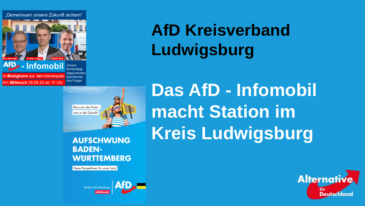 Am Mittwoch, den 26.08.2020 war es soweit. Das AfD Infomobil machte im Rahmen der Sommerkampagne des Landesverbands Station im Kreis Ludwigsburg. Genauer gesagt, am Bietigheimer Kronenzentrum.