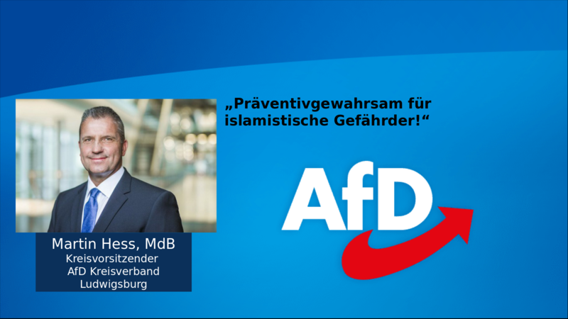 Berlin, 5. November 2020. Heute bringt die AfD-Bundestagsfraktion einen Antrag in den Deutschen Bundestag ein, in dem sie auf Bundesebene einen Präventivgewahrsam für islamistische Gefährder fordert. Martin Hess, stellv. innenpolitischer Sprecher der AfD-Bundestagsfraktion und ehem. Polizeihauptkommissar mit 27 Jahren Diensterfahrung, erklärt dazu: