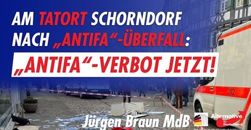 20 Linksextreme Schläger rannten mit einem Antifa-Banner am 20.2.21 um 9.45 Uhr auf den AfD Wahlkampfstand vom Landtagskandidaten Stefan Schwarz in Schorndorf zu und zerstörten den Stand und schlugen den AfDler krankenhausreif!