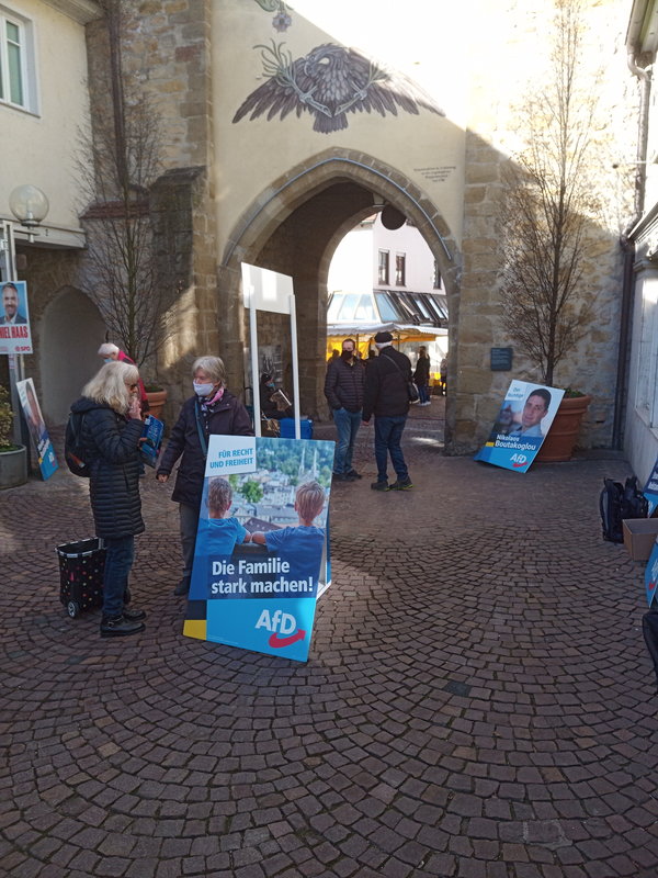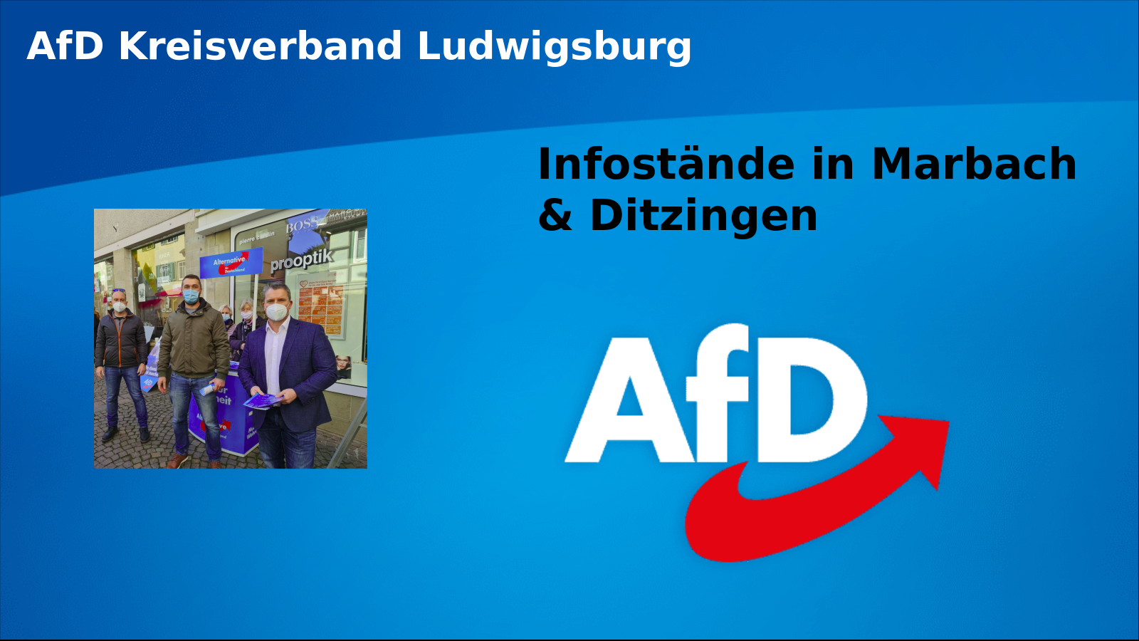 Auch am heutigen Samstag ließ es sich die Alternative für Deutschland nicht nehmen, in Kontakt mit den Wählerinnen und Wählern im Kreis Ludwigsburg zu treten. In Marbach und Ditzingen waren wir mit jeweils einem Infostand vertreten. Neben den vielen freiwilligen Helfern und dem Kreisvorstand waren auch die Landtagskandidaten Nikolaos Boutakoglou und Friedemann Meyer, sowie der Kreisvorsitzende und MdB Martin Hess vor Ort.