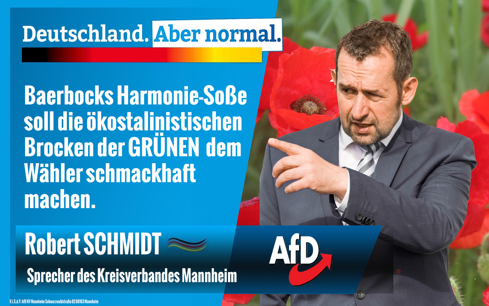 Für Deutschland wäre eine Bundesregierung unter Führung der Grünen oder auch nur deren Beteiligung eine Katastrophe. Das würde unser Land noch mehr spalten und uns staatlichen Zwang sowie Unfreiheit bescheren. Wie man im GRÜNEN Programmentwurf klar lesen kann, bewirken diese eine weitere Zerstörung von Wohlstand, Innerer Sicherheit und gesellschaftlichem Zusammenhalt. Ein GRÜNER Kandidat ist nichts weiter als eine Marionette dieses Programms, der Windrad- und Umweltlobby, von LGBT, Queeren und NGOs. Ein Gendergaga mehr, das künftig mit am Kabinettstisch sitzt und mitregiert. Leider ist ein Wahlerfolg der Grünen derzeit alles andere als unwahrscheinlich, denn Frau Baerbock kann unter anderem auf die Unterstützung und Hilfe der zahllosen Sympathisanten der Grünen bei den Journalisten und den Medien zählen. Die einst konservative CDU wurde jahrelang entkernt und die Hülle hat sich arrangiert. Die SPD ist zu verbandelt und in Abhängigkeit, als dass sie den Grünen gefährlich werden kann. Einzig die AfD wird die Verfehlungen einer Partei, die schon 15 Jahre über den Bundesrat mitregiert, aufdecken. Egal ob Tempolimit, „Greta-Steuer, das wird teuer“ oder das jüngst geforderte Verbot von Einfamilienhäusern, nur die AfD hat widersprochen. Wir vertreten aus dem Wunsch nach Freiheit das Gegenteil von den einschnürenden Forderungen dieser Verbotspartei. Egal ob schwarz-rot-gelb oder dunkelrot; SIE BEKOMMEN GRÜN. Blau ist die Farbe des Jahres 2021.