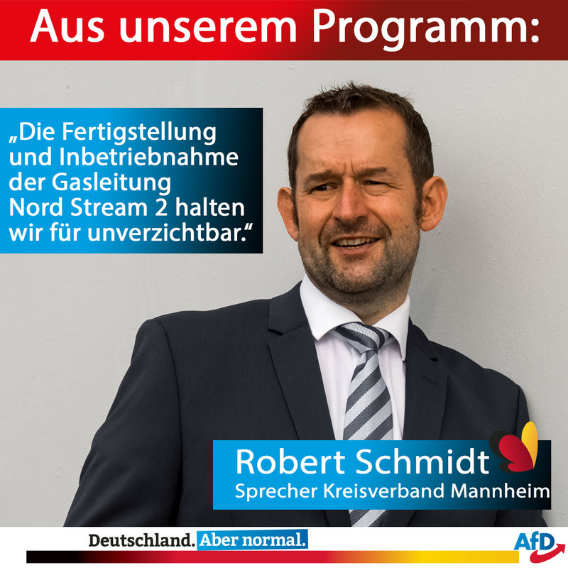 Die Mehrheit der AfD Delegierten in Dresden hat den Bau von „Nord Steam 2“ ebenfalls befürwortet und zwei mal ins Wahlprogramm aufgenommen. Interessanterweise führen wir unter anderem unter dem Stichpunkt Außen- und Verteidigungspolitik aus: