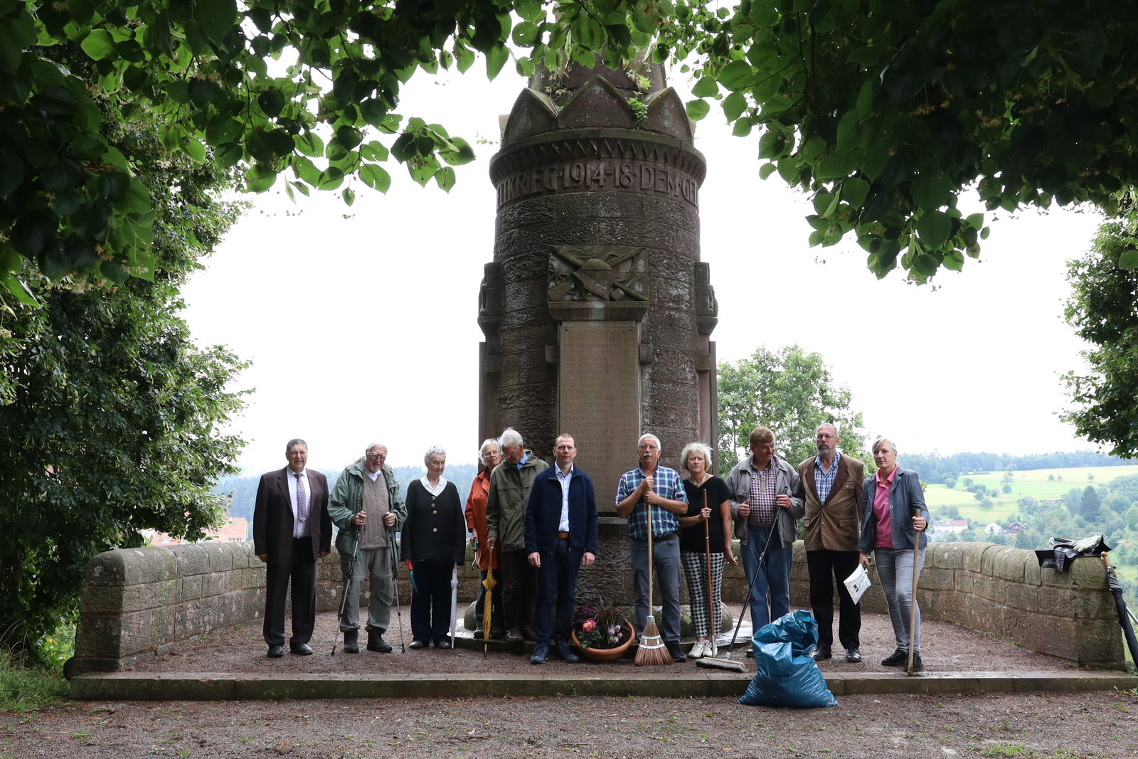 13 erschienene Bürger reinigten und entgrasten das Podium des Denkmals. Die in zehn Metern Höhe wachsenden Pflanzen, die auf Dauer die Substanz des Gemäuers zerstören könnten, sollten nach Meinung der Akteure vom Bauhof der Stadt entfernt werden. Nach der Aktion erfolgte die Niederlegung einer Blumenschale und kurze Ansprachen von Günther Schöttle, Uwe Thaler, Heinrich Kuhn und Marcus Lotzin. Schöttle beklagte einen geschichtsvergessenen, würdelosen Umgang mit der Vergangenheit. Sachlich vorgetragene Argumente würden heute mit Polemik beantwortet. Es werde versucht, die Geschichte in der Versenkung verschwinden zu lassen. Solche Orte dürften nicht "durch unangemessene Feste entweiht" werden. Lotzin verwies auf Gefallene heutiger Bundeswehreinsätze im Ausland. Es grause ihn bei dem Gedanken, dass diesen gleiche Respektlosigkeit widerfahren könnte, wie den Gefallenen der Weltkriege.