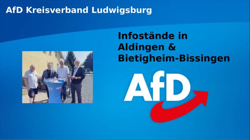Auch am vergangenen Samstag war der Kreisverband Ludwigsburg in Sachen "Deutschland.Aber normal." wieder auf der Straße. Mit zwei parrallel stattfindenden Infoständen waren wir diesmal in Aldingen und Bietigheim-Bissingen unterwegs. Mit dabei wieder viele engagierte Mitglieder, ein Großteil des Kreisvorstandes und natürlich unser Spitzenkandidat für Ludwigsburg, Martin Hess (MdB).