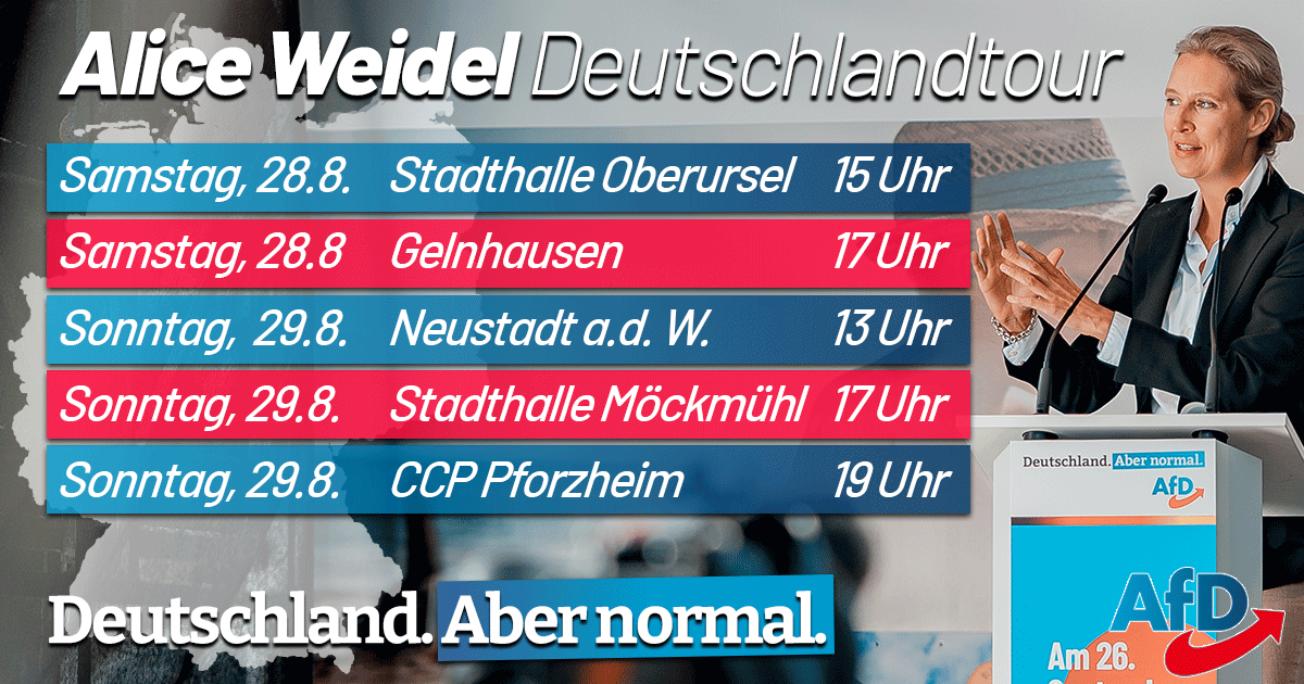 Der Wahlkampf geht in die heiße Phase - und wir starten in ein Wochenende voller Wahlkampftermine. Wenn Sie noch nichts vorhaben, dann wäre jetzt die Gelegenheit, sich ein eigenes Bild von der AfD zu machen!