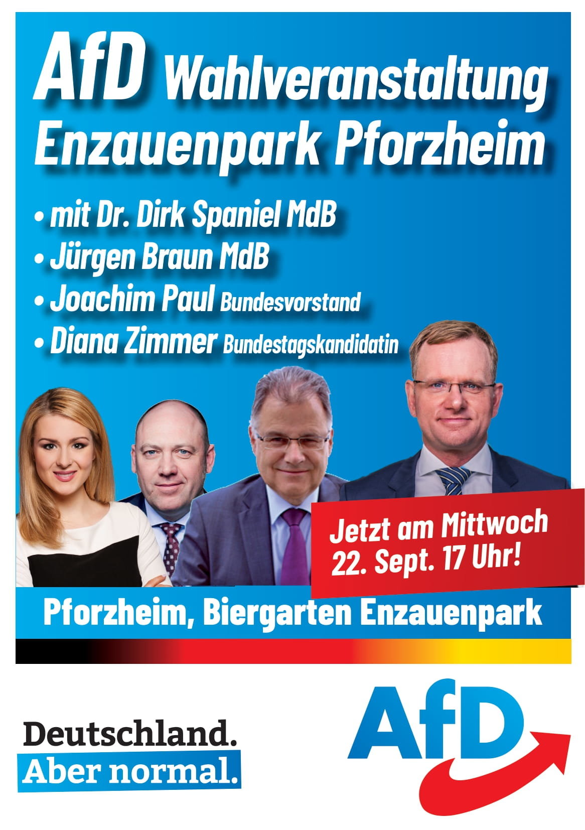 Am Mittwoch, 22. September ab 17 Uhr. AfD Wahlkampfveranstaltung in Pforzheim Biergarten Enzauenpark. Mit Dr. Dirk Spaniel, Jürgen Braun, Joachim Paul und unserer Bundestagskandidatin Diana Zimmer. Kommen Sie vorbei, lassen Sie sich von unseren Rednern überraschen. Es lohnt sich! Wir freuen uns auf Ihren Besuch.