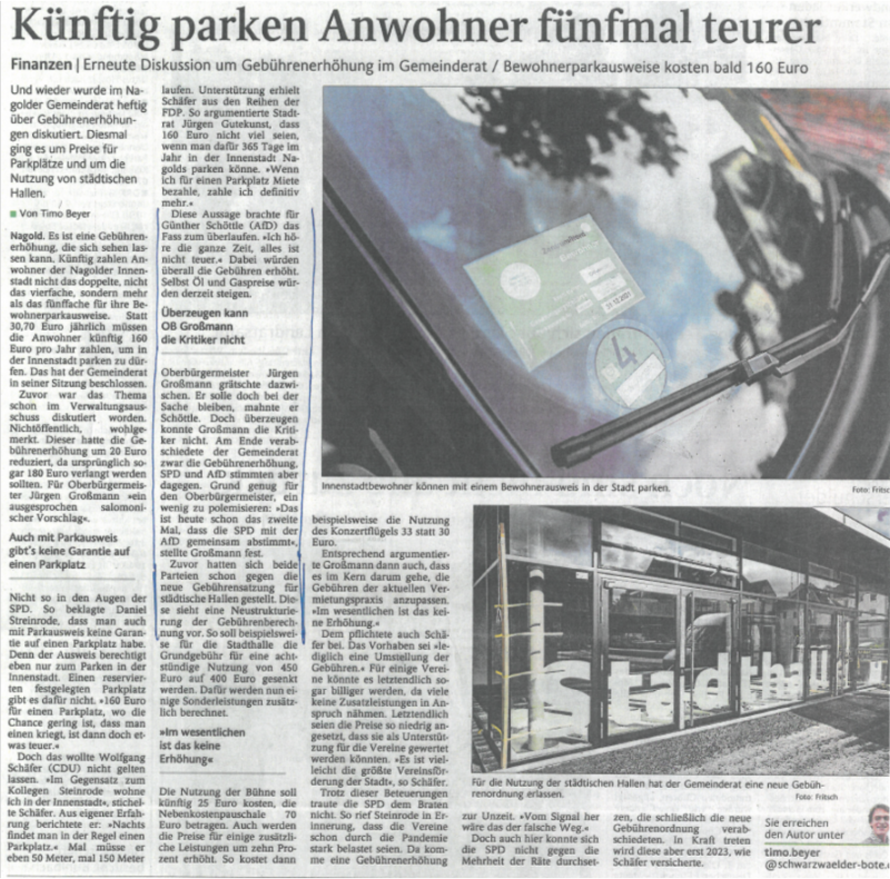 Nun konnte aber noch nicht einmal die SPD-Fraktion im Nagolder Stadtrat einem Vorschlag der Verwaltung folgen, die das Anwohnerparken in der Stadt Nagold – also auf Parkplätzen, die am Straßenrand liegen, für die es keine Garantie der Nutzung gibt und die der freien Witterung ausgesetzt sind und die darüber hinaus dem Neid von Missgünstigen ausgesetzt sind, eine Erhöhung der bisherigen Anwohnerparkgebühren um 500% zu stimmen.