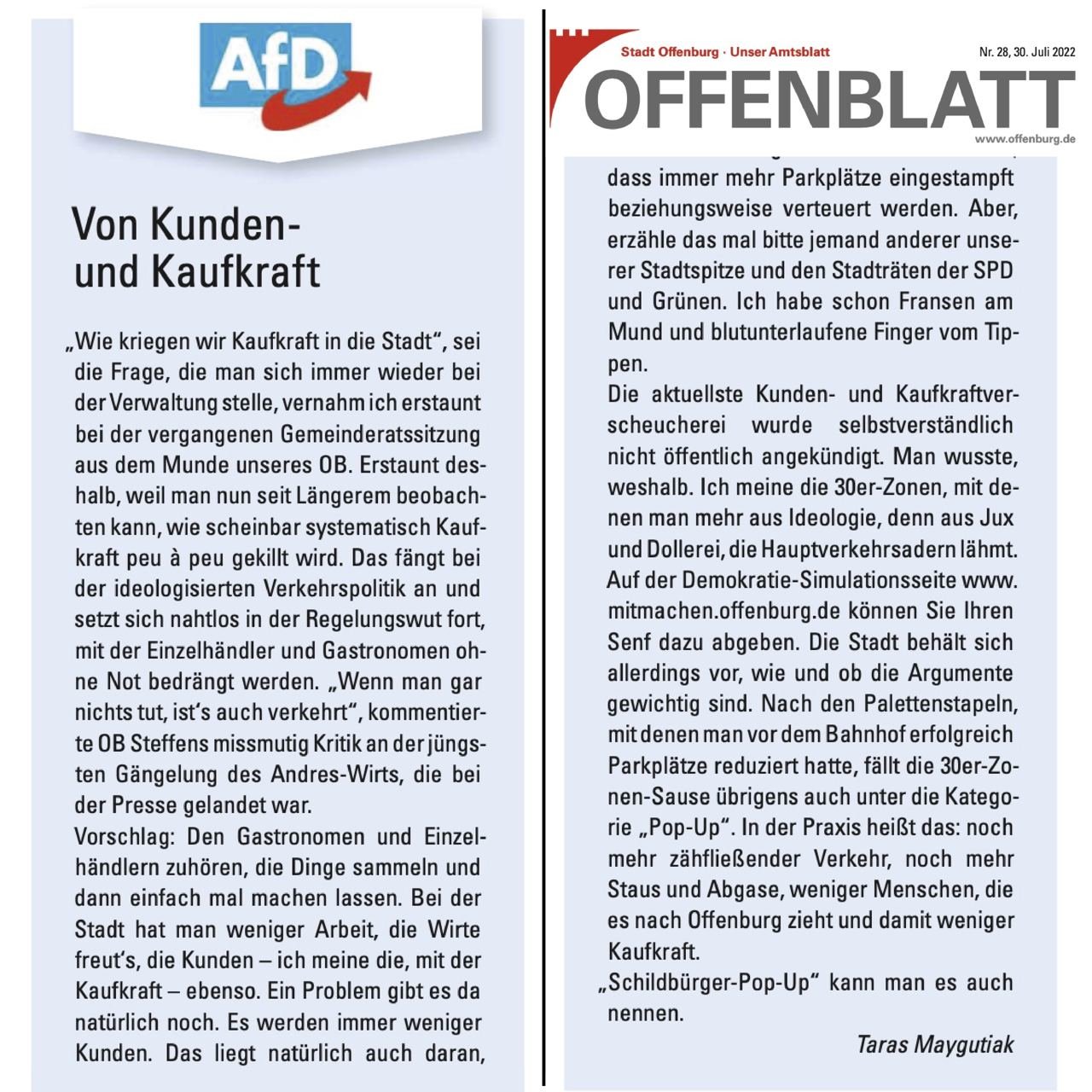 Die aktuellste Kunden- und Kaufkraftverscheucherei wurde selbstverständlich nicht öffentlich angekündigt. Man wusste, weshalb. Ich meine die 30er-Zonen, mit denen man mehr aus Ideologie, denn aus Jux und Dollerei, die Hauptverkehrsadern lähmt. Auf der Demokratie-Simulationsseite www.mitmachen.offenburg.de können Sie Ihren Senf dazu abgeben. Die Stadt behält sich allerdings vor, wie und ob die Argumente gewichtig sind. Nach den Palettenstapeln, mit denen man vor dem Bahnhof erfolgreich Parkplätze reduziert hatte, fällt die 30er-Zonen-Sause übrigens auch unter die Kategorie „Pop-Up“. In der Praxis heißt das: noch mehr zähfließender Verkehr, noch mehr Staus und Abgase, weniger Menschen, die es nach Offenburg zieht und damit weniger Kaufkraft. „Schildbürger-Pop-Up“ kann man es auch nennen.