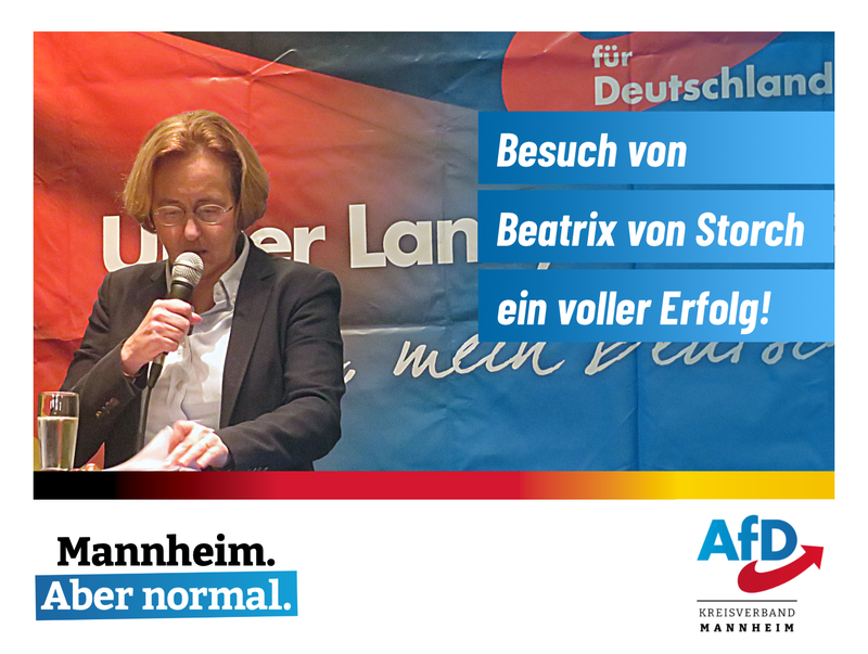 Während der Corona-Zwangs-Pause konnten nur kleinere Veranstaltungen stattfinden. Jetzt wurde es wieder möglich zu einer öffentlichen Veranstaltung mit Prominenz aus Berlin einzuladen. Am 15.11.2022 war Frau Beatrix von Storch in Mannheim zu Gast