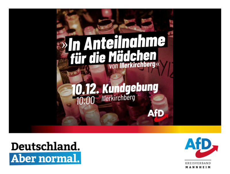 in Abstimmung mit der Versammlungsbehörde können wir bekanntgeben, dass unsere Kundgebung unter dem Titel "In Anteilnahme für die Mädchen von Illerkirchberg" am morgigen Samstag, den 10.12.2022, ab 10.00 Uhr auf dem Rathausplatz in Illerkirchberg stattfinden wird.