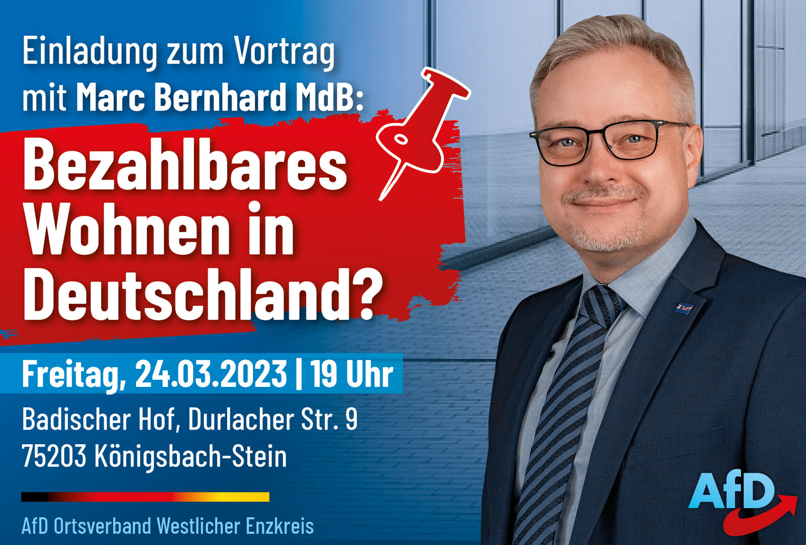 Am Freitag, 24.03.23 um 19 Uhr lädt der Ortsverband Westlicher Enzkreis zum Vortragsabend ein. Gastredner Marc Bernhard, MdB.