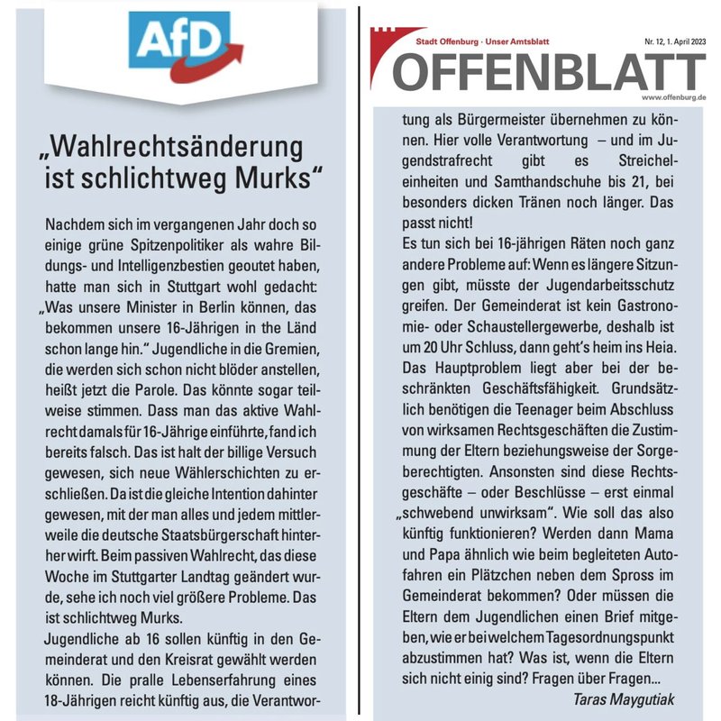 Jugendliche ab 16 sollen künftig in den Gemeinderat und den Kreisrat gewählt werden können. Die pralle Lebenserfahrung eines 18-Jährigen reicht künftig aus, die Verantwortung als Bürgermeister übernehmen zu können. Hier volle Verantwortung und im Jugendstrafrecht gibt es Streicheleinheiten und Samthandschuhe bis 21, bei besonders dicken Tränen noch länger. Das passt nicht!