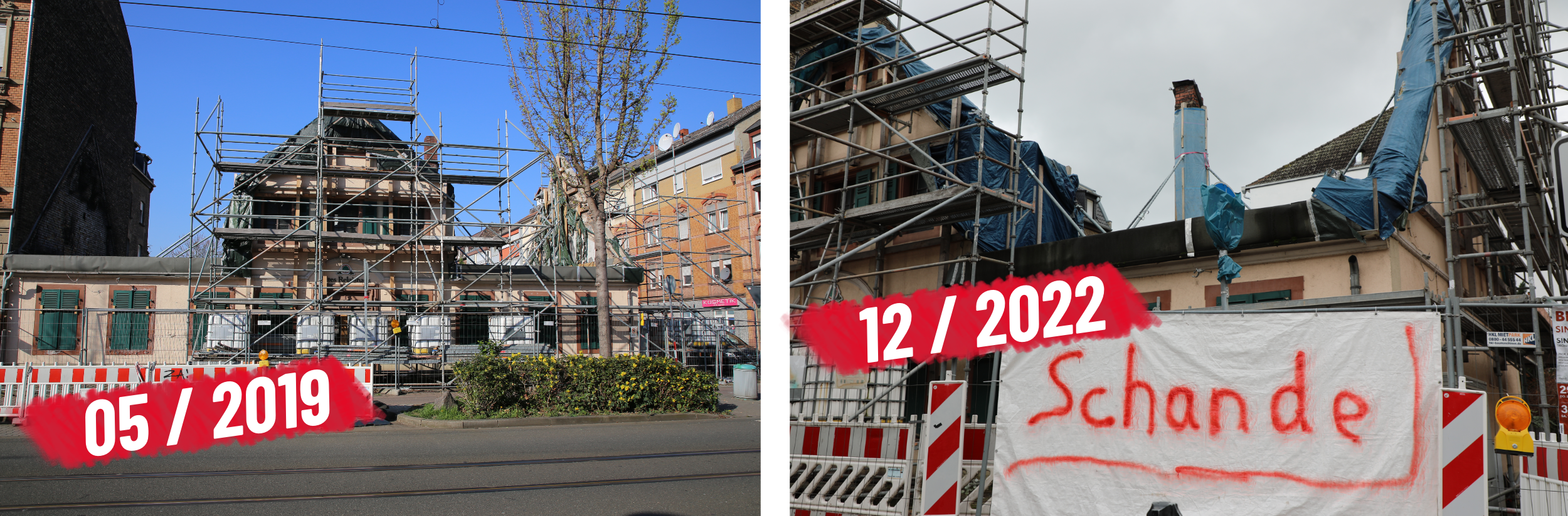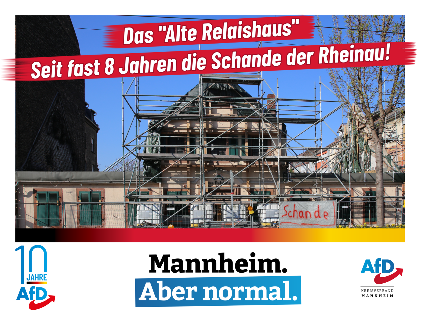 Das Kulturdenkmal „Altes Relaishaus“ ist eines der ältesten Mannheimer Gebäude und dazu noch denkmalgeschützt. Viele Mannheimer kennen es in seiner alten Pracht, war und ist Identifikationspunkt der Menschen in Mannheim-Rheinau. Am 21.10.2015 ging es in Flammen auf, der Eigentümer wurde wegen Brandstiftung verurteilt und seitdem steht dort eine von Gerüsten getragene Brandruine – und das Gebäude zerfällt, möglicherweise unwiderruflich. Trotz aller wortreichen, vollmundigen Bekundungen, auch des derzeitigen SPD-Oberbürgermeisterkandidaten und Rheinauer Stadtrates Riehle, ist bislang nichts Wirkliches geschehen. Naja, vielleicht war das Feiern auf der Buga Eröffnung hipper als sich um die realen Dinge der Mannheimer zu kümmern.