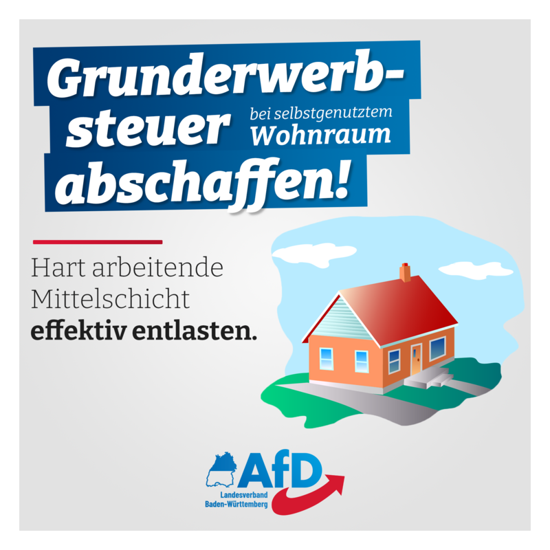 "Der Staat schafft es nicht, seine großspurigen Versprechungen beim Wohnungsbau zu halten, will aber gleichzeitig weiter Bürger für ihren Traum vom Eigenheim abkassieren. Die hart arbeitende Mitte unserer Gesellschaft wird durch die Grunderwerbsteuer doppelt belastet, muss sie doch bereits mit steigenden Baukosten, Zinsen und den drohenden Heizungsverboten von Herrn Habeck kämpfen. Es ist an der Zeit, die Bürger von diesem Druck zu befreien. Die AfD befürwortet die Abschaffung der Grunderwerbsteuer bei selbst genutztem Wohneigentum."
