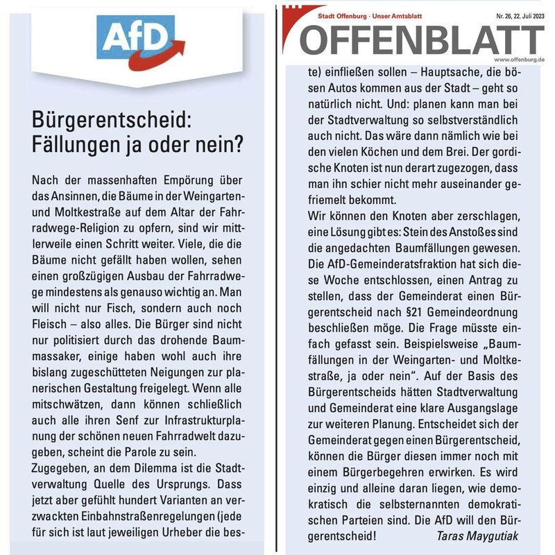 Wir können den Knoten aber zerschlagen, eine Lösung gibt es: Stein des Anstoßes sind die angedachten Baumfällungen gewesen. Die AfD-Gemeinderatsfraktion hat sich diese Woche entschlossen, einen Antrag zu stellen, dass der Gemeinderat einen Bürgerentscheid nach §21 Gemeindeordnung beschließen möge. Die Frage müsste einfach gefasst sein. Beispielsweise "Baumfällungen in der Weingarten- und Moltkestraße, ja oder nein". Auf der Basis des Bürgerentscheids hätten Stadtverwaltung und Gemeinderat eine klare Ausgangslage zur weiteren Planung. Entscheidet sich der Gemeinderat gegen einen Bürgerentscheid, können die Bürger diesen immer noch mit einem Bürgerbegehren erwirken. Es wird einzig und alleine daran liegen, wie demokratisch die selbsternannten demokratischen Parteien sind. Die AfD will den Bürgerentscheid!