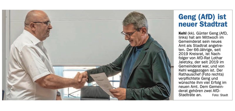 Kehl (kk). Günter Geng (AfD, links) hat am Mittwoch im Gemeinderat sein neues Amt als Stadtrat angetre- ten. Der 66-Jährige, seit 2019 Kreisrat, ist Nach- folger von AfD-Rat Lothar Jaletzky, der seit 2019 im Gemeinderat war, und von Kehl weggezogen ist. Der Rathauschef (Foto rechts) verpflichtete Geng und wünschte ihm viel Erfolg im neuen Amt. Dem Gemein- derat gehören zwei AfD- Stadträte an. Foto: Stadt