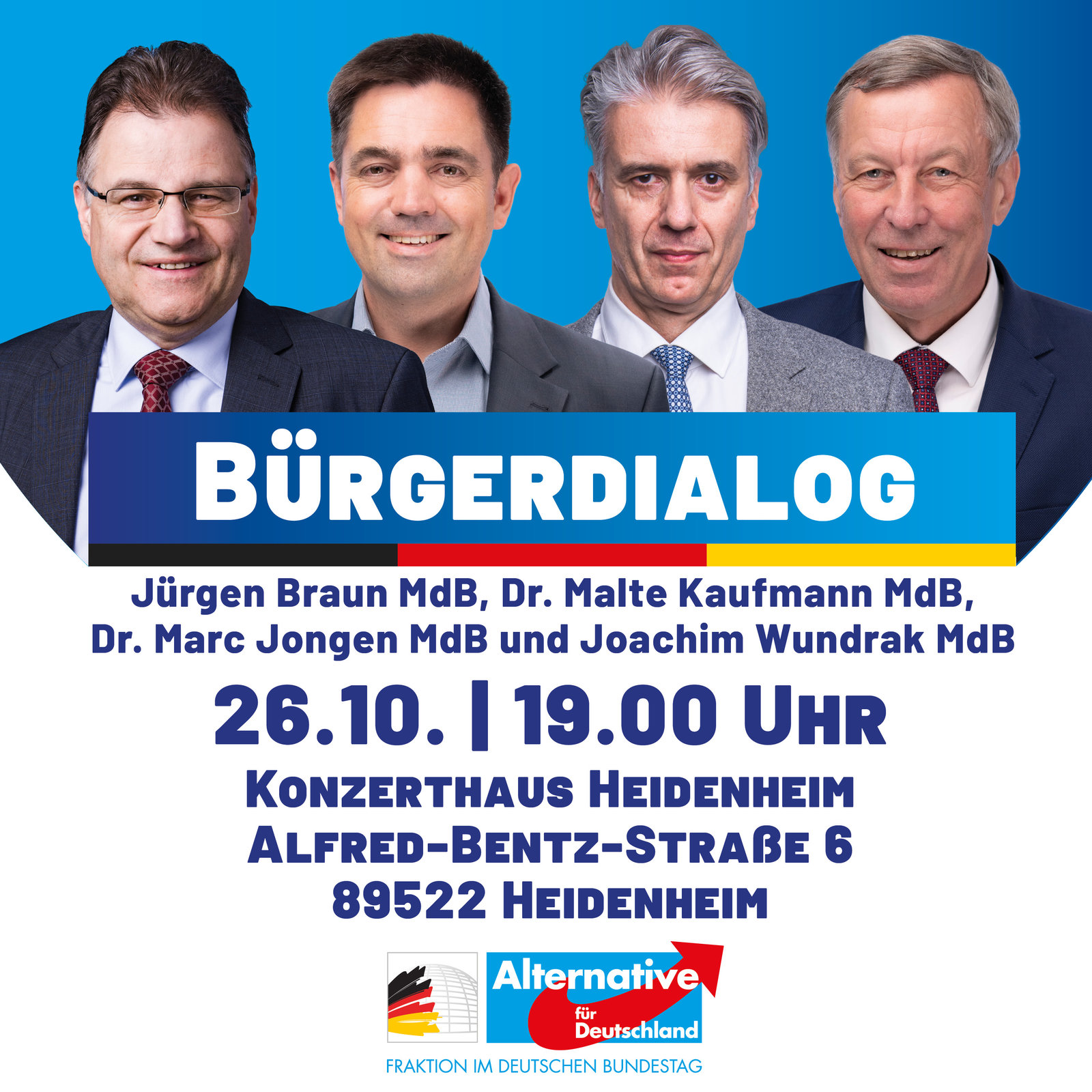 Die Landesgruppe Baden-Württemberg der AfD-Fraktion im Deutschen Bundestag lädt am 26.10.2023 herzlich zum Bürgerdialog in das Heidenheimer Konzerthaus ein. Wir freuen uns auf die Reden der Bundestagsabgeordneten Jürgen Braun MdB, Dr. Malte Kaufmann MdB, Dr. Marc Jongen MdB und Joachim Wundrak MdB über brandaktuelle Themen, die Situation und die Zukunft Deutschlands. Im Anschluss daran stehen die Redner für die Bürger Rede und Antwort. Treten Sie mit den Abgeordneten in den Dialog! Für die Zukunft Deutschlands ist es derzeit wichtiger denn je, dass Klartext gesprochen wird, wohin uns diese disaströse Regierungspolitik der Ampel-Parteien führen wird, und die Merkel-Regierung bereits geführt hat. Eine echte Opposition und eine Perspektive für die Zukunft Deutschlands gibt es nur mit der Alternativen für Deutschland!