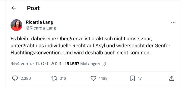 Die Bundestagsabgeordnete aus dem Bundestagswahlkreis Backnang-Gmünd, Lang, hat sich heute in einem Tweet auf der Plattform X gegen eine Obergrenze und für weitere Massenzuwanderung ausgesprochen: