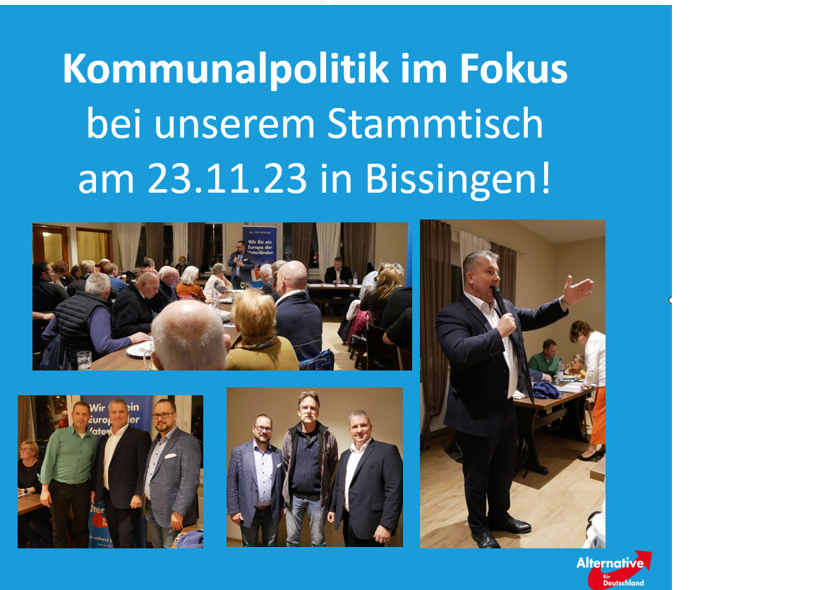 Mit überraschend hohem Zulauf fand am Donnerstag, 23.11.2023, unser regelmäßiger Stammtisch statt. Neben bereits langjährigen Mitgliedern zeigten auch viele neue Gesichter großes Interesse zum Thema des Abends "die anstehenden Kommunalwahlen am 09. Juni 2024". Martin Hess (MdB) konnte dabei gleich zwei Referenten begrüßen, die erfolgreich auf kommunaler Ebene für die AfD im Rennen sind.