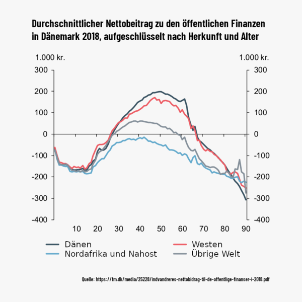 In zwei Lebensabschnitten beansprucht der durchschnittliche Däne seinen Staat mehr, als er zu ihm beiträgt: Während des Heranwachsens bis zum Alter von etwa 27 Jahren und ab dem Renteneintritt im Alter von etwa 67 Jahren. Dazwischen steuert er 40 Jahre lang netto zu den öffentlichen Finanzen bei und trägt in dieser Zeit den Staat Dänemark.