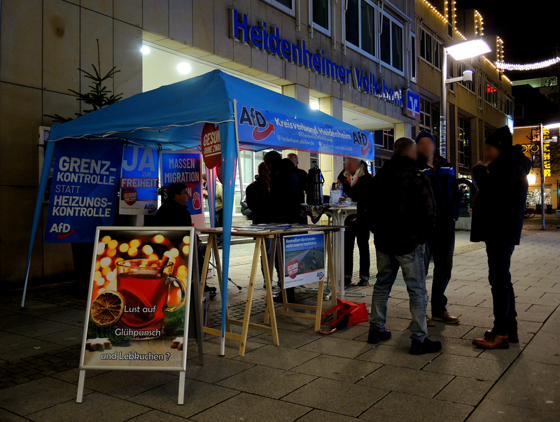 Bei kostenlosem Glühpunsch und Lebkuchen stieß unser Info-Stand in Heidenheim wieder einmal mehr auf ein reges Interesse. In weihnachtlicher Abendstimmung wurden interessante Gespräche geführt. Mehr und mehr Menschen erkennen, dass die katastrophale Politik der Ampelregierung unser Land nun scheinbar vollends an die Wand fährt. Der enorme Zuspruch zur Alternativen für Deutschland kommt daher nicht von ungefähr. Der AfD Kreisverband Heidenheim verzeichnet - analog auch auf Bundesebene - seit geraumer Zeit schon einen fulminanten Anstieg der Mitgliederzahlen. Werde auch Du aktiv, wirke mit, rede mit, werde Mitglied in der AfD. Damit wir unser Land wieder vom Kopf auf die Beine stellen können - bevor es zu spät ist. Schreib uns einfach eine E-Mail an heidenheim@afd-bw.de