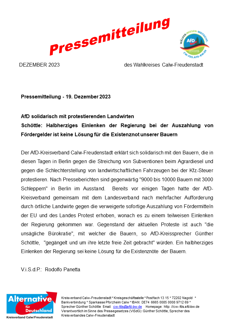 Der AfD-Kreisverband Calw-Freudenstadt erklärt sich solidarisch mit den Bauern, die in diesen Tagen in Berlin gegen die Streichung von Subventionen beim Agrardiesel und gegen die Schlechterstellung von landwirtschaftlichen Fahrzeugen bei der Kfz-Steuer protestieren. Nach Presseberichten sind gegenwärtig "9000 bis 10000 Bauern mit 3000 Schleppern" in Berlin im Ausstand. Bereits vor einigen Tagen hatte der AfD-Kreisverband gemeinsam mit dem Landesverband nach mehrfacher Aufforderung durch örtliche Landwirte gegen die verweigerte sofortige Auszahlung von Fördermitteln der EU und des Landes Protest erhoben, wonach es zu einem teilweisen Einlenken der Regierung gekommen war. Gegenstand der aktuellen Proteste ist auch "die unsägliche Bürokratie", mit welcher die Bauern, so AfD-Kreissprecher Günther Schöttle, "gegängelt und um ihre letzte freie Zeit gebracht" würden. Ein halbherziges Einlenken der Regierung sei keine Lösung für die Existenznöte der Bauern.