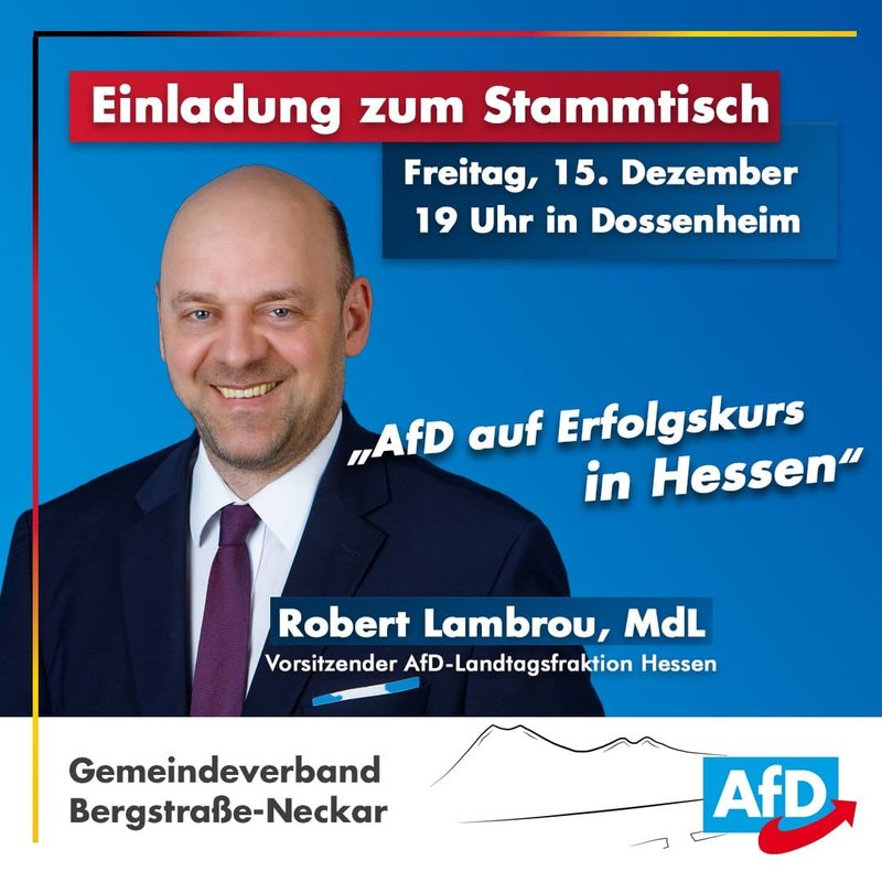Als Ehrengast konnten wir den Fraktionsvorsitzenden von Hessen, Robert Lambrou, gewinnen, der mit einem spannenden Vortrag Einblicke in den dortigen Wahlkampf gewährte. Im Anschluss gab es eine Fragerunde, mit lebhaften Austausch, über die Geheimnisse des Wahlerfolg in Hessen, den Umgang mit den Medien, die aktuelle Bildungspolitik und viele andere interessante Themen. Selbst nach 3 Stunden konnten sich viele Mitglieder nur schwer aus den entstandenen Gesprächen lösen. Ein rundum gelungener Abend.