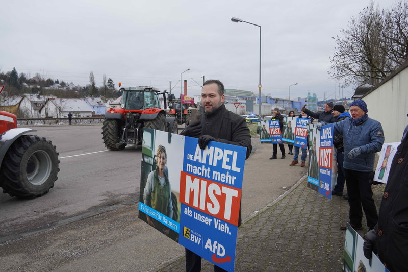 „Gemeinsam mit meinen Mitstreitern von der AfD war ich am Montag auf den Schießtalplatz gekommen, um die Landwirte in ihrem Protest zu unterstützen. Im Gespräch mit einem Vertreter des regionalen Bauernverbandes wurde mir mitgeteilt, dass sowohl die CDU mit Frau Gräßle als auch die Grünen mit Frau Häußler im Vorfeld kontaktiert und eingeladen wurden. Keine der beiden Abgeordneten war am Ende tatsächlich vor Ort gekommen. Einzig die AfD ist mit mir als Gmünder Abgeordneter und weiteren Mitstreitern spürbar zur Mitwirkung erschienen. Angeblich, so sagte ein Ordner zu mir, seien alle Abgeordneten aus Schwäbisch Gmünd durch den Bauernverband angeschrieben und eingeladen worden. Leider habe ich keine Einladung erhalten, weder per E-Mail noch per Brief. Ich bitte Herrn Weber darum, seine Funktion als Vertreter der Landwirte für den Raum Schwäbisch Gmünd zukünftig neutral und mit mehr Bedacht auszuüben. Schließlich ist es einzig die AfD, die sich für unsere Landwirte starkmacht und wenn es darauf ankommt auch präsent ist. Zudem sollte Herrn Weber die Stimmung der Landwirte in der Region besser einzuschätzen wissen. Unsere Plakataktion, mit der wir die Proteste sichtbar unterstützen konnten, wurde von großen Teilen der beteiligten Landwirte mit viel Zuspruch bekräftigt. Es ist einzig die AfD, die sich für die deutsche Landwirtschaft einsetzt und für die Interessen der Landwirte einsteht.“