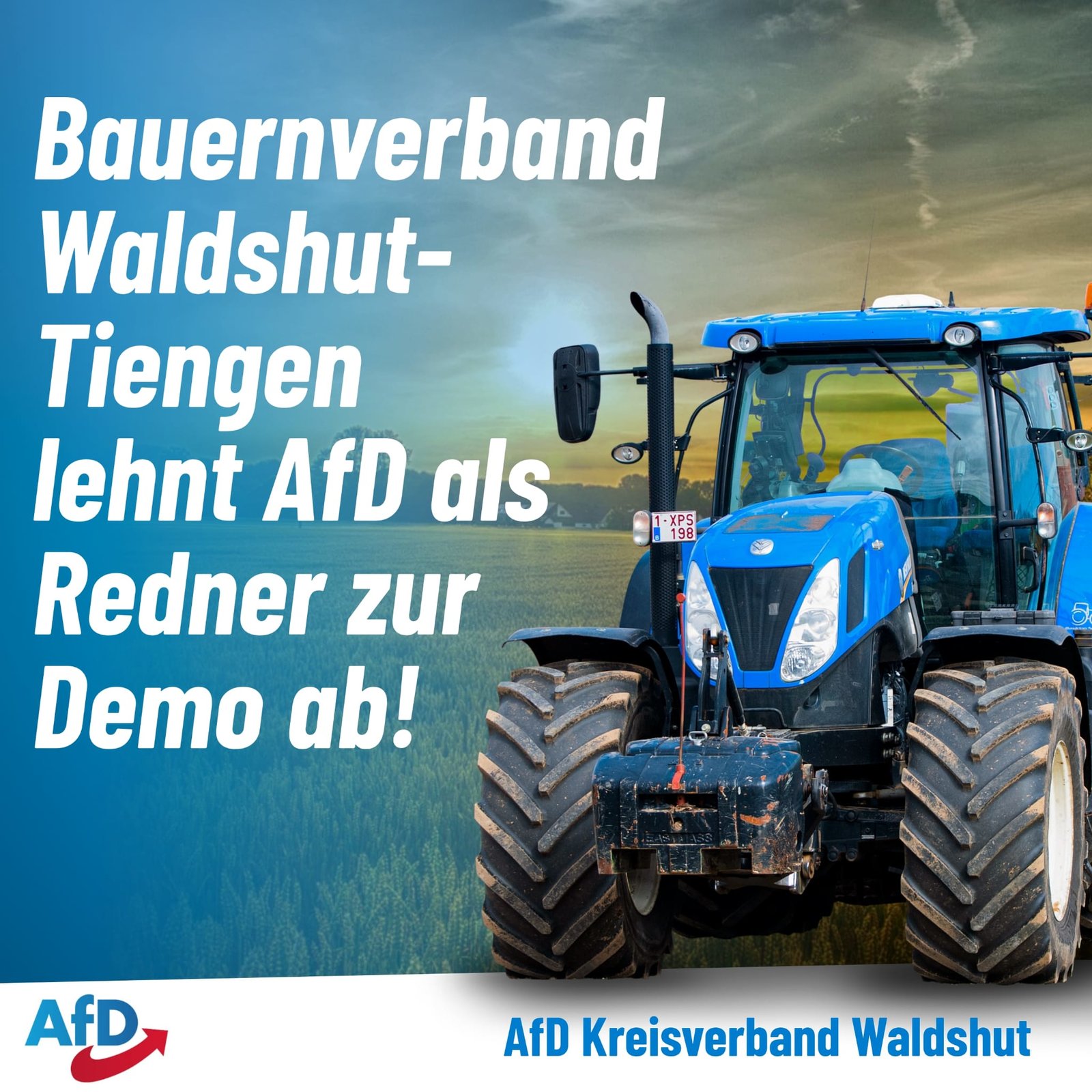 Der Badischer Landwirtschaftlicher Hauptverband e.V, lehnte unsere Anfrage in Bezug auf die morgige Demo in Waldshut-Tiengen unter dem Motto: »Landwirtschaft braucht Zukunft« ab. Gerne hätten wir als Alternative für Deutschland im Landkreis Waldshut zur Kundgebung gesprochen.