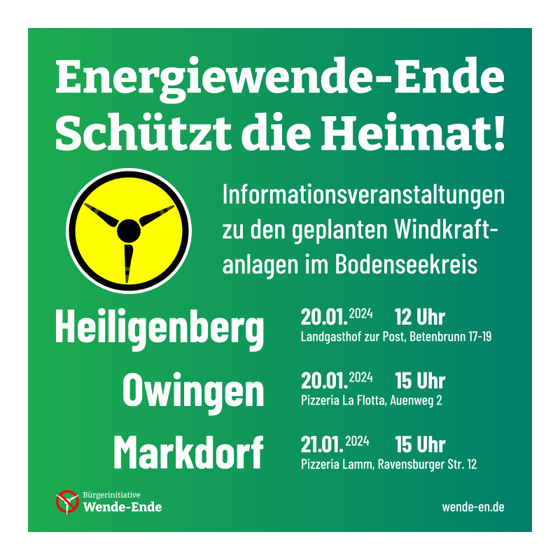 In Kooperation mit der Bürgerinitiative Wende-Ende informieren wir die Anwohner der vom Windradbau bedrohten Gebiete im Bodenseekreis über die Gefahr und Nutzlosigkeit von Windkraftanlagen: