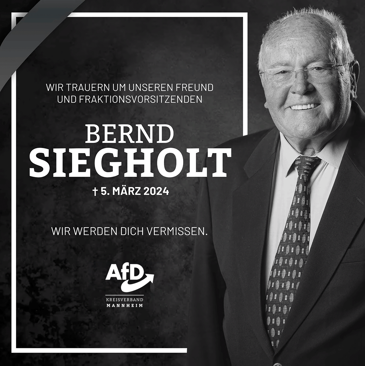 Mit großem Bedauern und in aufrichter Trauer müssen wir Ihnen leider mitteilen, dass unser Fraktionsvorsitzender, Bernd Siegholt, verstorben ist.
